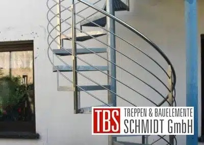 Die gewendelte Aussentreppe und die Gitterroststufen sind aus feuerverzinktem Stahl gefertigt. Das Treppengeländer besteht aus Edelstahl.