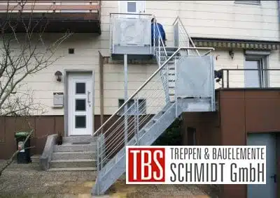 Außentreppe Viertelgewendelt Die feuerverzinkte außenbefindliche Stahltreppe verläuft viertelgewendelt nach oben. Die Treppenstufen bestehen aus Gitterroststufen.