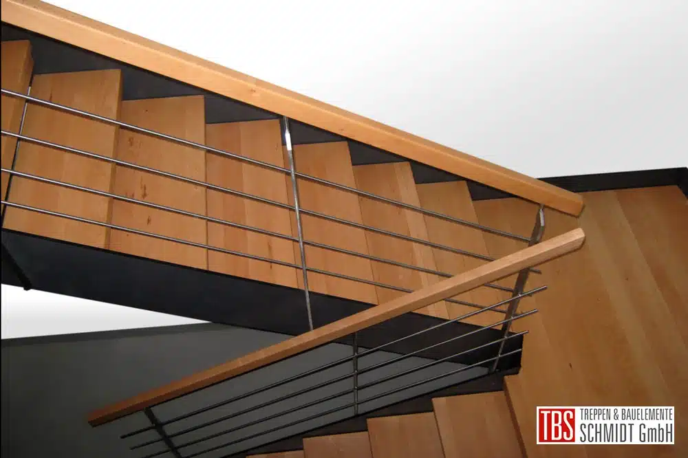 Das Edelstahlgeländer besteht aus vier liegenden Stäben und einem eckigen Holzhandlauf, der ebenfalls aus Buche gefertigt ist.