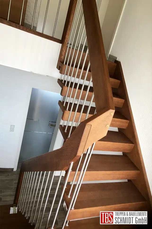 Die Handlauftragende Wangen-Bolzentreppe ist in Eiche dunkel geölt gefertigt und verläuft über 15 Steigungen, mit einem Zwischenpodest in das Obergeschoss. Die senkrechten Edelstahlstäbe bilden mit dem eckigen Holzhandlauf das Steiggeländer, welches in der kleinen Brüstung fließend fortgeführt wird.