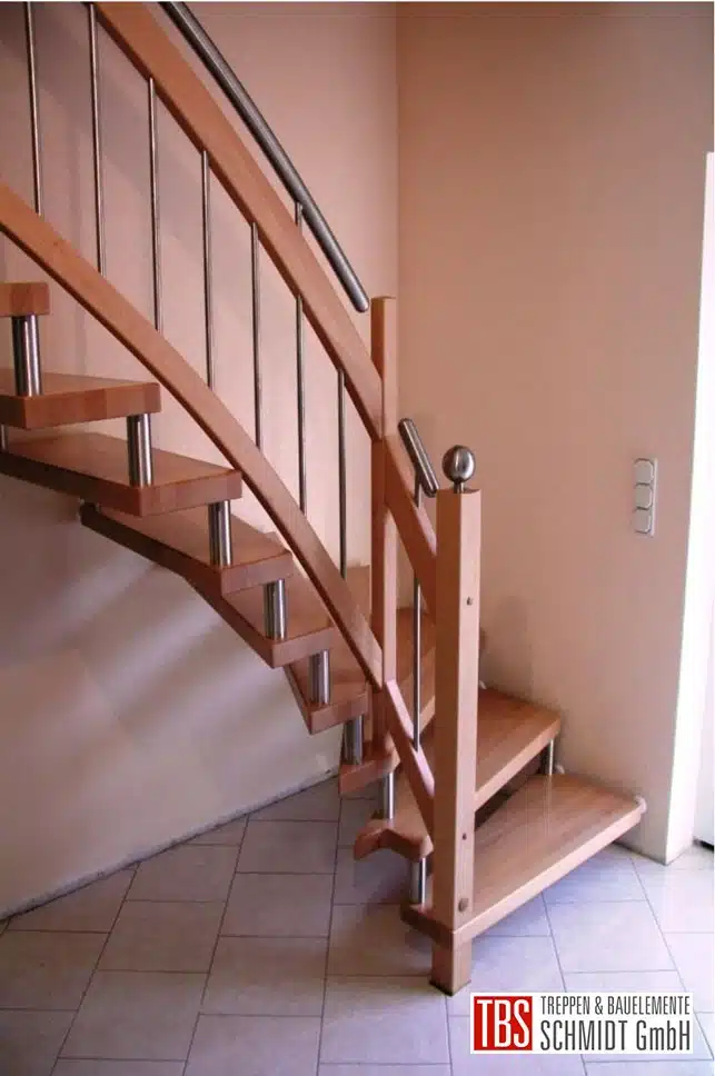 Die Bolzentreppe aus Buche führt viertelgewendelt durch den Eingangsbereich in das Obergeschoss. Das Treppengeländer ist aus einer Holz-Edelstahl Kombination gefertigt. Senkrechte Edelstahlstäbe sind zwischen dem Holzgerüst eingesetzt, an der Oberkante befindet sich ein runder Edelstahlhandlauf und auf dem Pfosten ist eine Dekokugel befestigt.