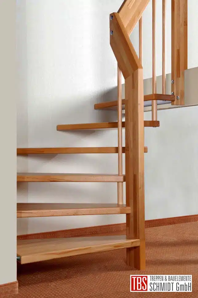 Die Bolzentreppe aus Buche verbindet eine Zwischenetage mit dem Wohnraum des Hauses miteinander und führt viertelgewendelt über 7 Steigungen. Das Treppengeländer ist vollständig aus Holz gefertigt und bildet zugleich die Bolzen.