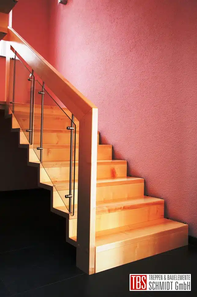 Die handlauftragende Faltwerktreppe aus Buche verläuft über 16 Steigungen halbgewendelt, mit einem Zwischenpodest, in das Obergeschoss. Die Edelstahlpfosten sind zwischen dem Holzhandlauf und den Trittstufen befestigt und daran sind die Glasplatten montiert.