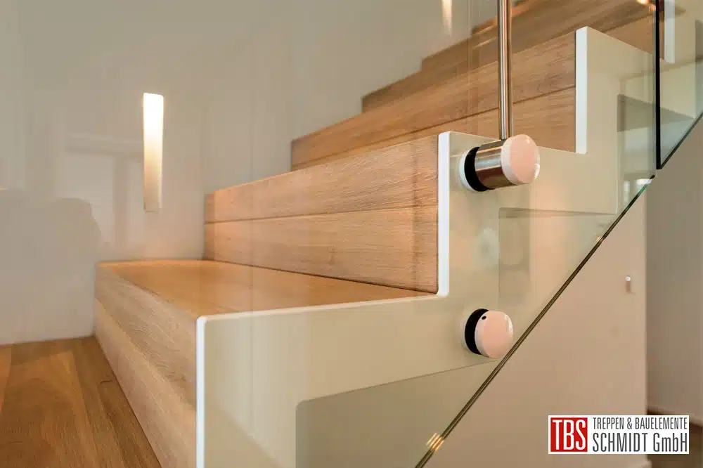 Die gerade Faltwerktreppe ist in Eiche weiß geölt gefertigt, das Glasgeländer ist mit weißen Punkthaltern an die weiße Verblendung der Stufenköpfe befestigt.