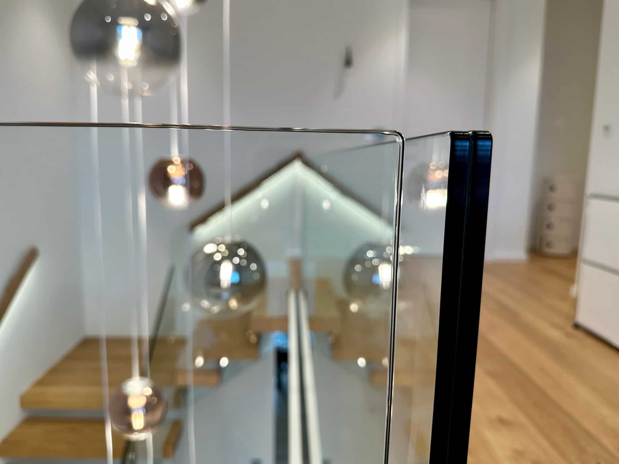Das individuellen Glasgeländers verbindet das Brüstungs- und Treppengeländer passgenau miteinander. Das abgeschrägte Brüstungsgeländer verläuft mit der darüberliegenden Glasscheibe passend in der Flucht und bildet eine harmonisches Gesamterscheinung. Die Edelstahlpunkthalter werden durch die Stufenverblender abgedeckt.