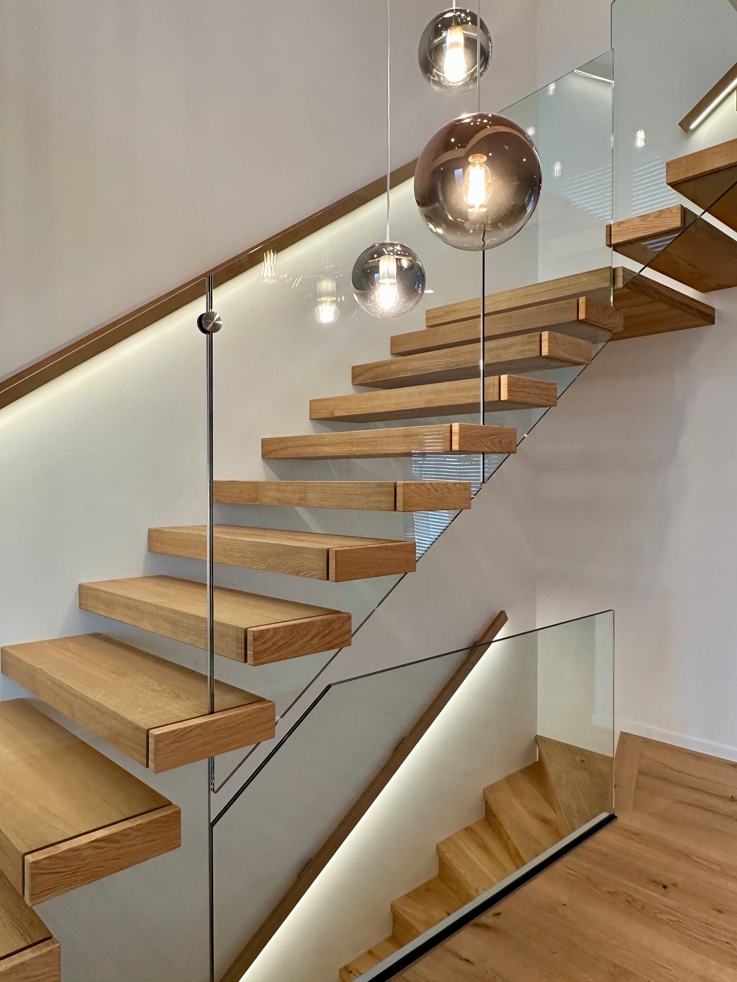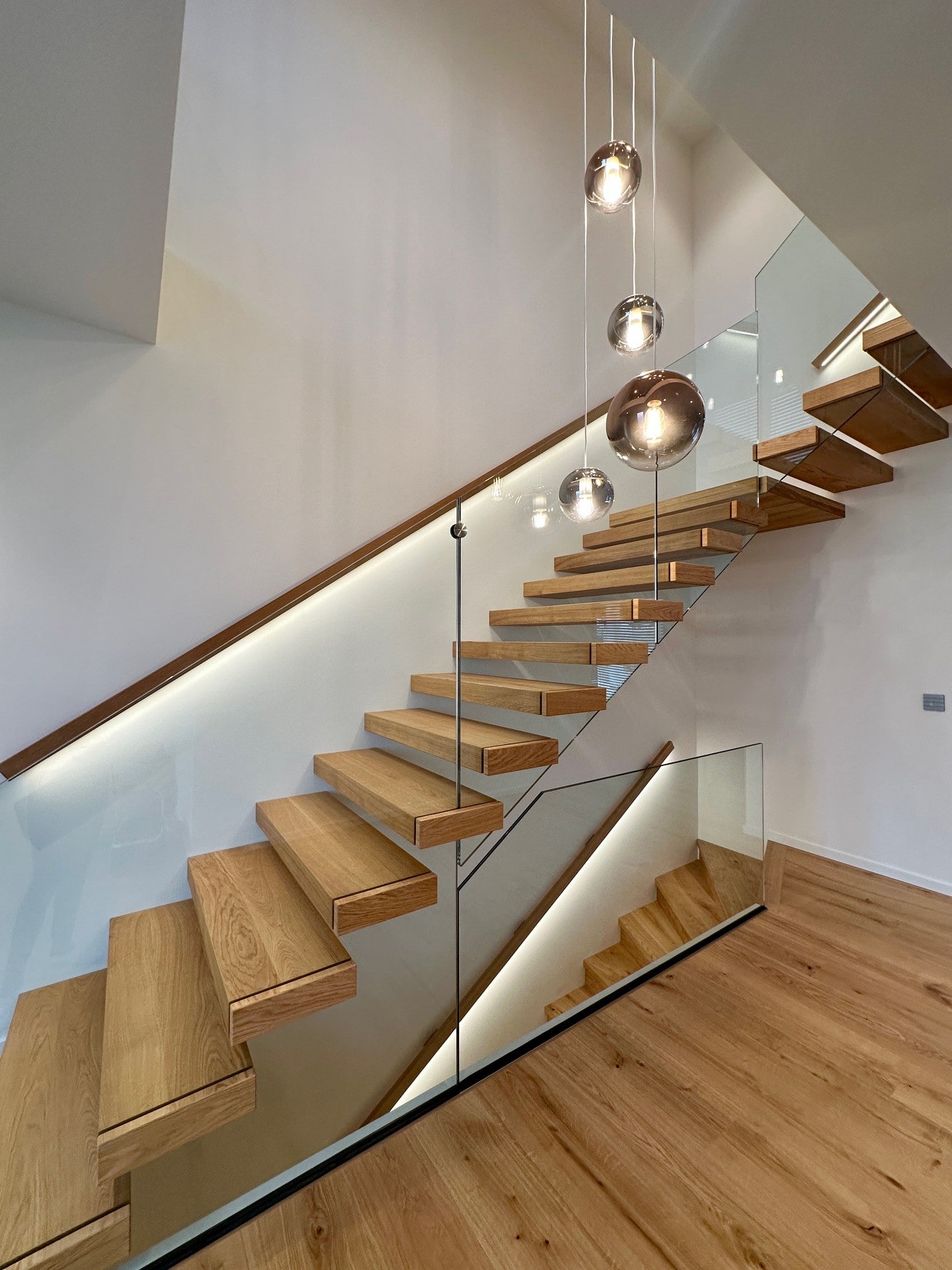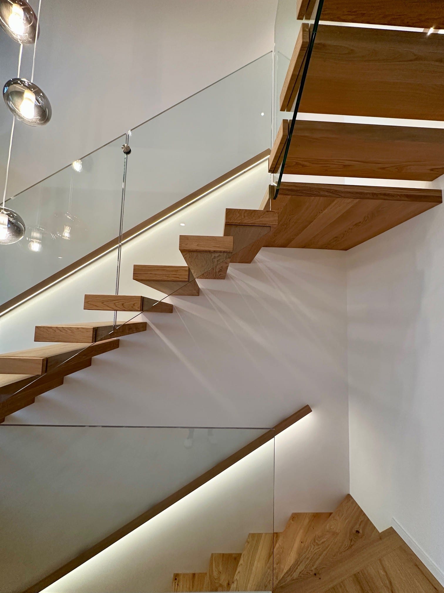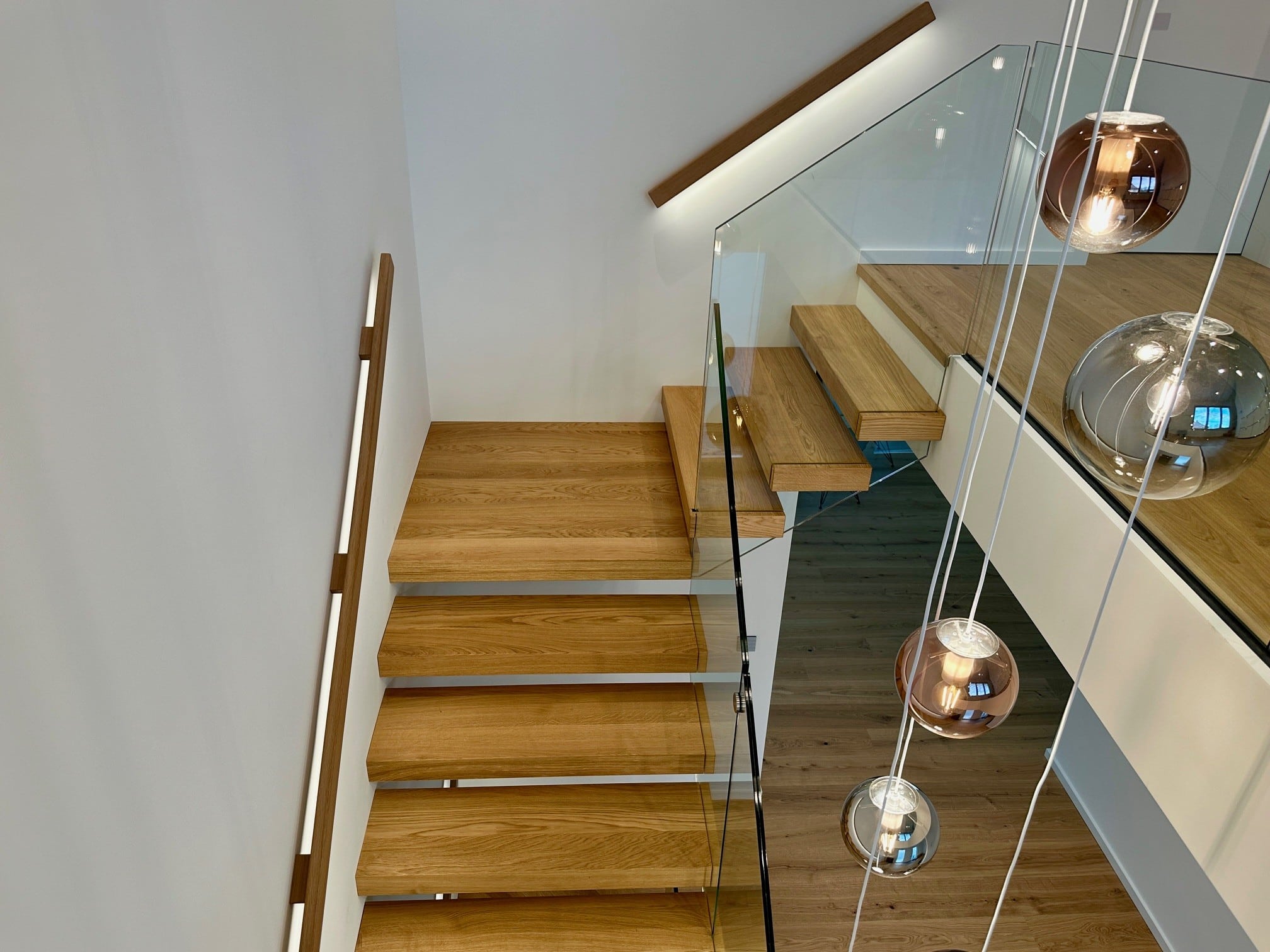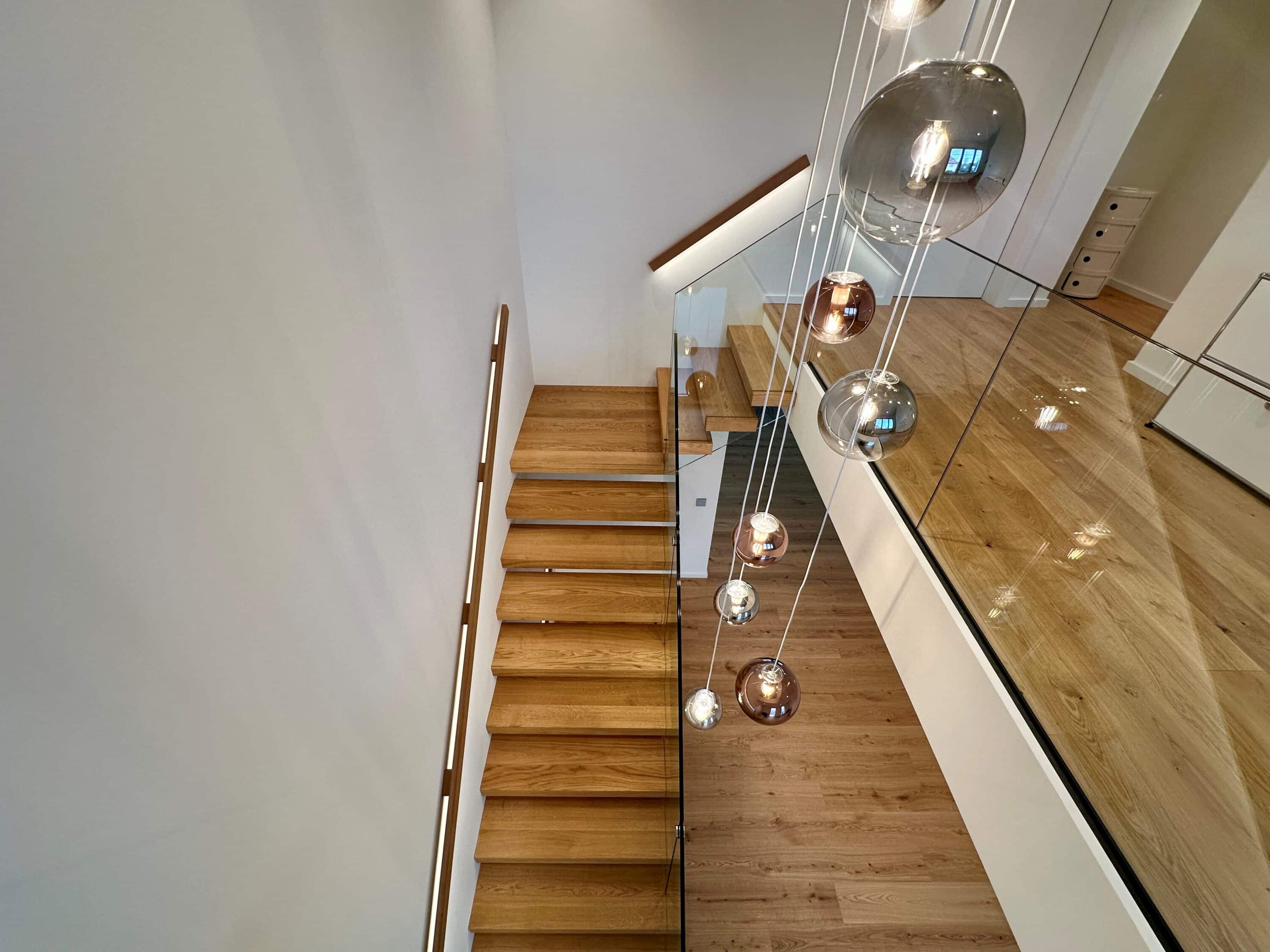 Über 17 Steigungen verläuft die Kragarmtreppe mit Eck-Zwischenpodest, gefertigt aus Eiche sauber, durch den imposanten Eingangsbereich. Das Glasgeländer beginnt ab der ersten Stufe, um die Edelstahlpunkthalter abzudecken, sind Stufenverblender montiert. Dies lässt den Anschein erwirken, dass das Glas in die Stufen eingefräst ist. Der beleuchtete Holzwandhandlauf wird bei der Kellertreppe ebenso fortgeführt. In der Galerie gibt die Glasbrüstung einen tollen Blick auf die Treppenanlage