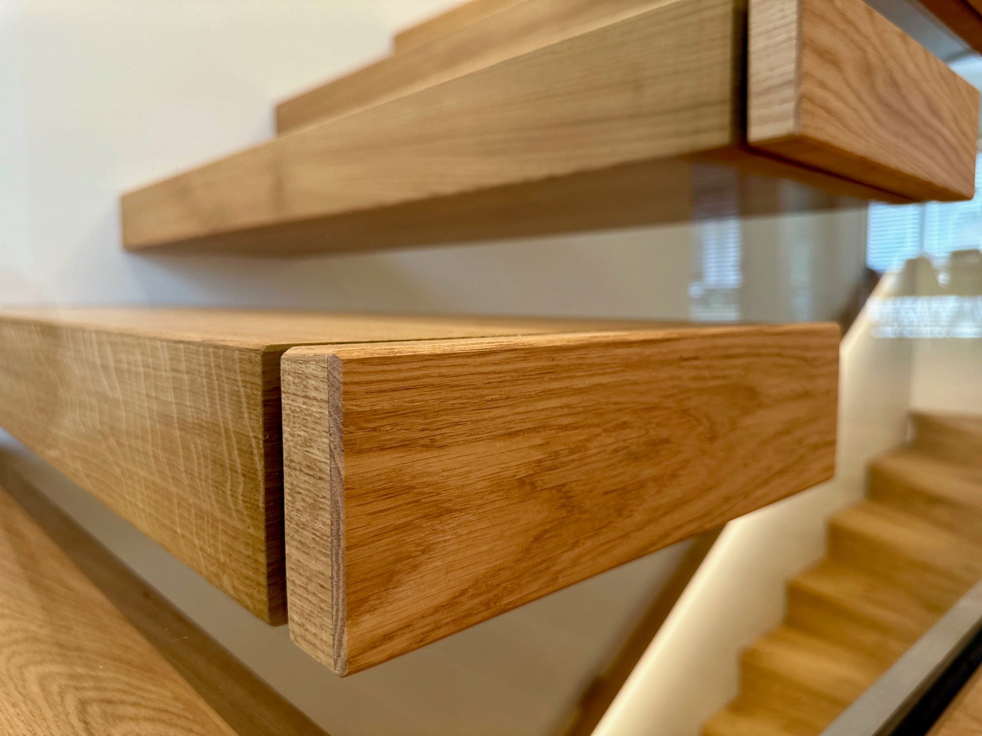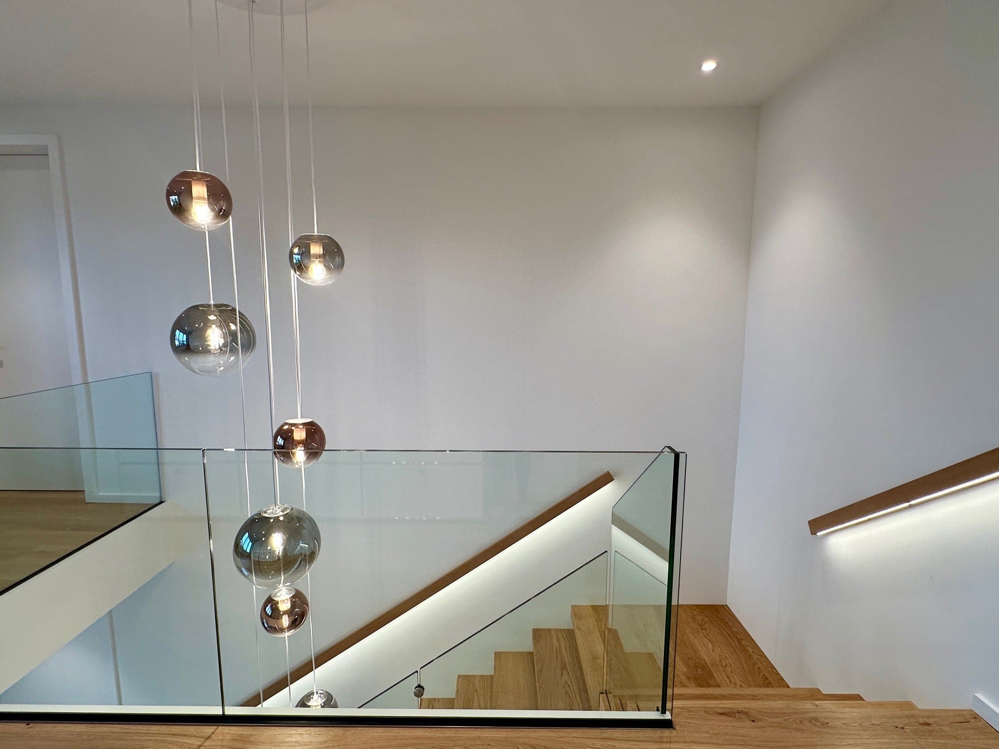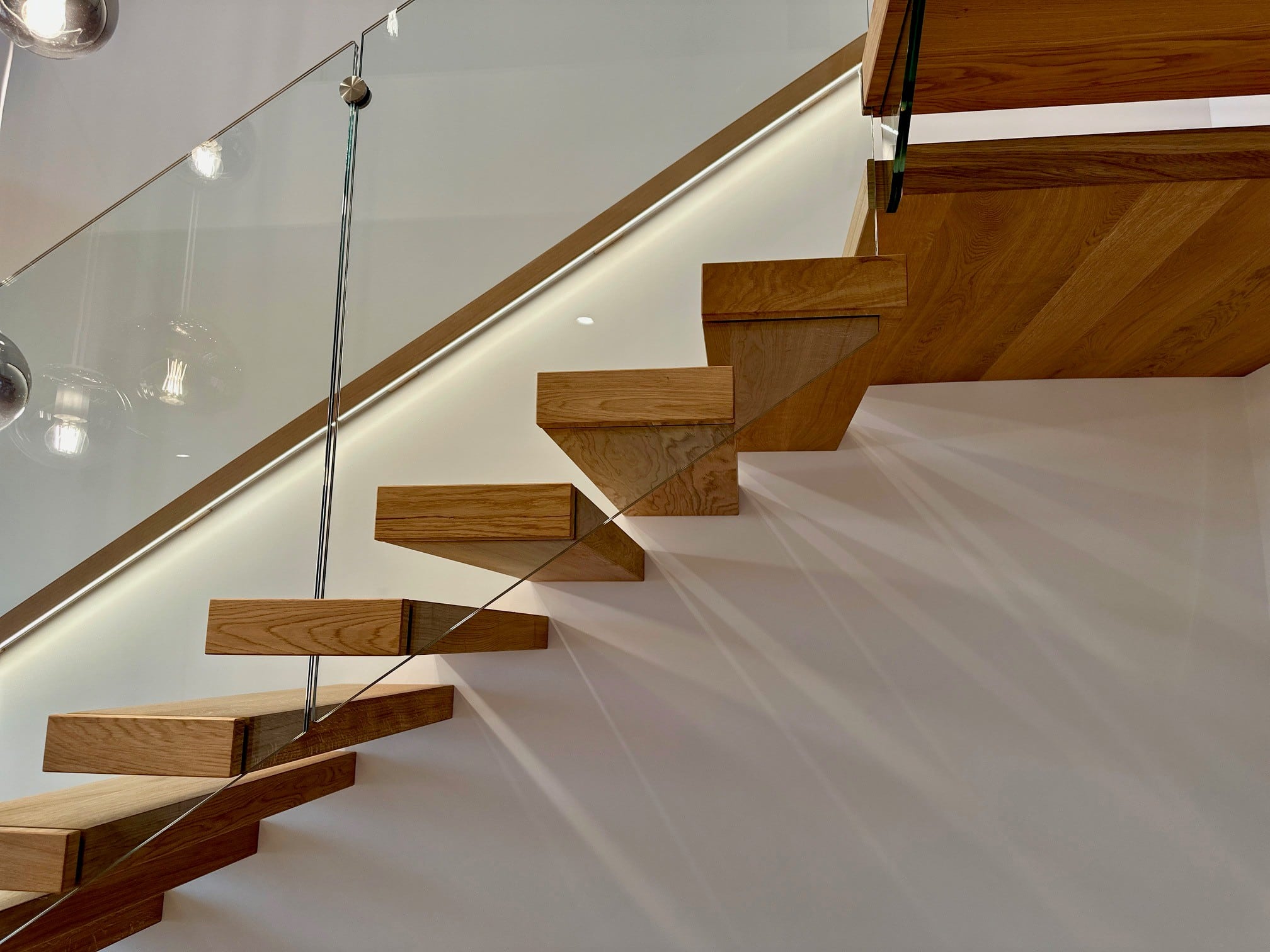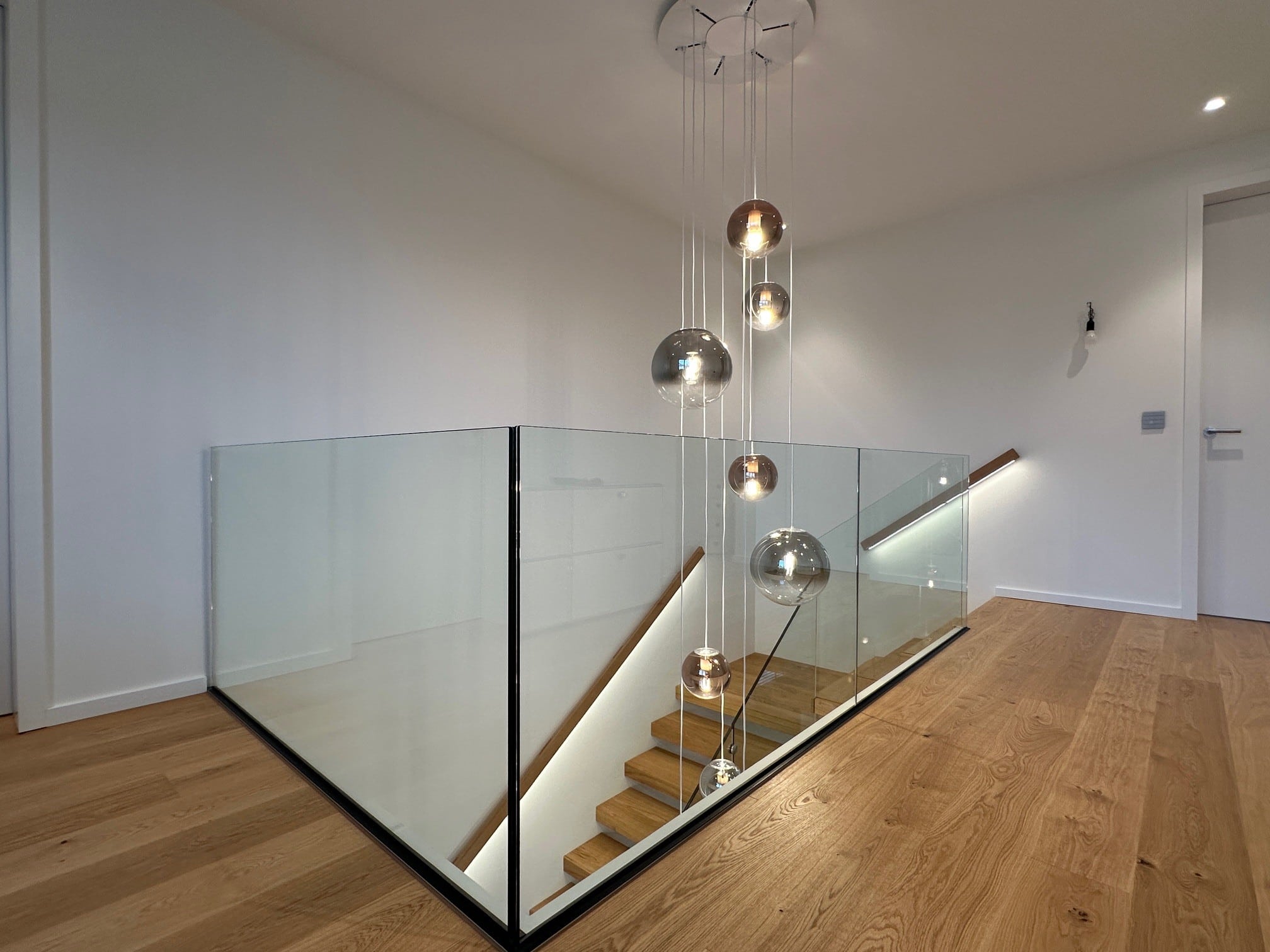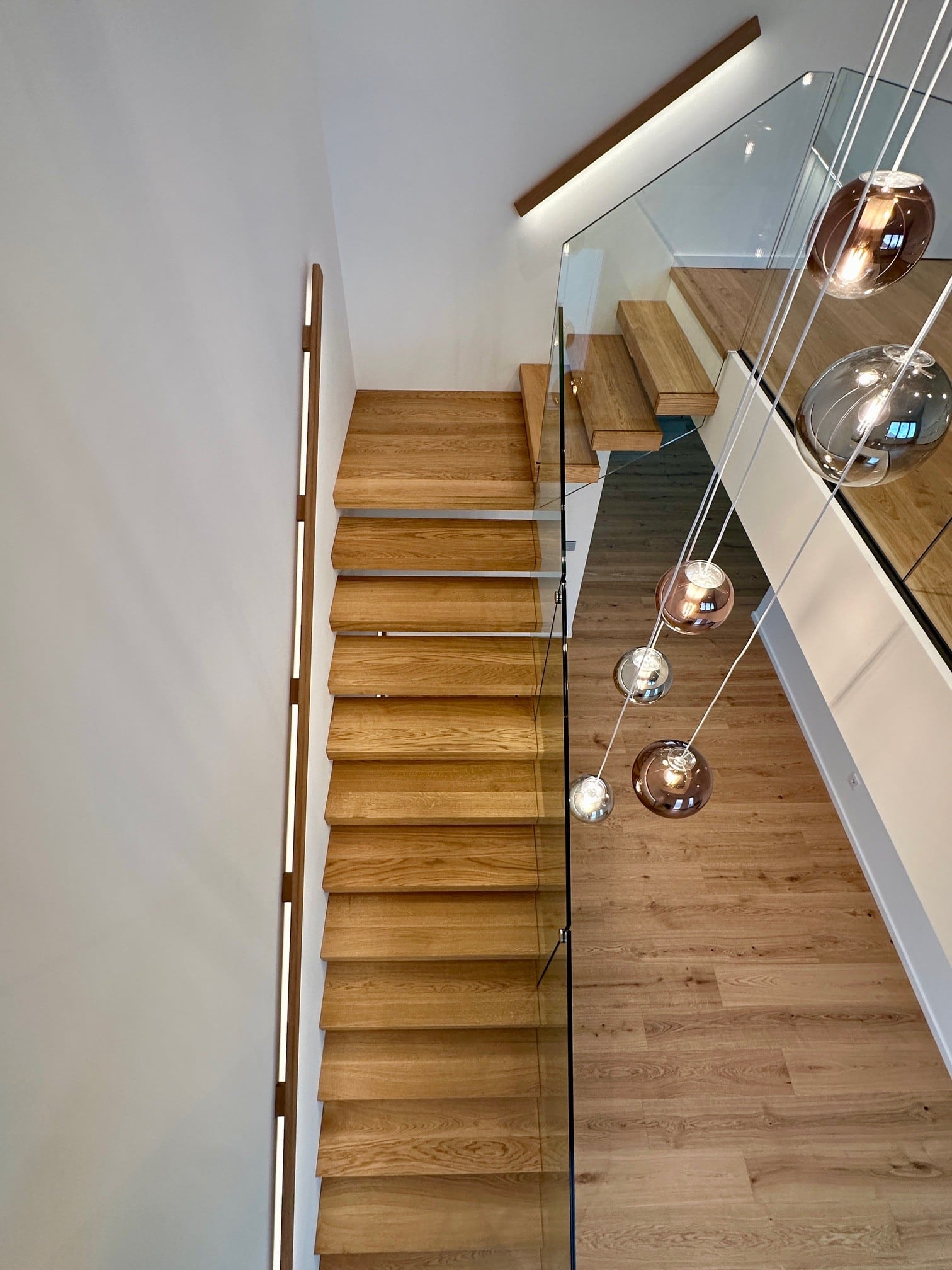 Über 17 Steigungen verläuft die Kragarmtreppe mit Eck-Zwischenpodest, gefertigt aus Eiche sauber, durch den imposanten Eingangsbereich. Das Glasgeländer beginnt ab der ersten Stufe, um die Edelstahlpunkthalter abzudecken, sind Stufenverblender montiert. Dies lässt den Anschein erwirken, dass das Glas in die Stufen eingefräst ist. Der beleuchtete Holzwandhandlauf wird bei der Kellertreppe ebenso fortgeführt. In der Galerie gibt die Glasbrüstung einen tollen Blick auf die Treppenanlage
