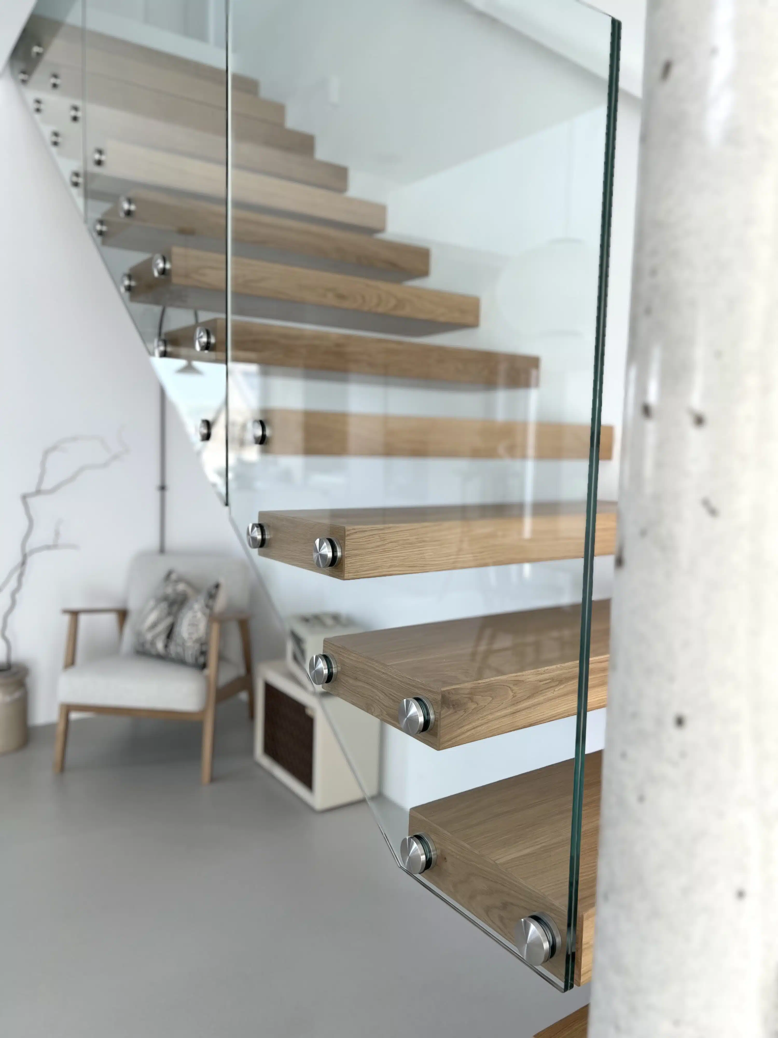 Die Kragarmtreppe verläuft über 16 Steigungen als gerade Treppenanlage ins Obergeschoss. Ab der vierten Stufe beginnt das dreiteilige Glasgeländer, welches in der Galerie fortgeführt wird. Aufgrund des statisch notwendigen Pfostens sind die dort parallel verlaufenden Stufen geteilt angefertigt.