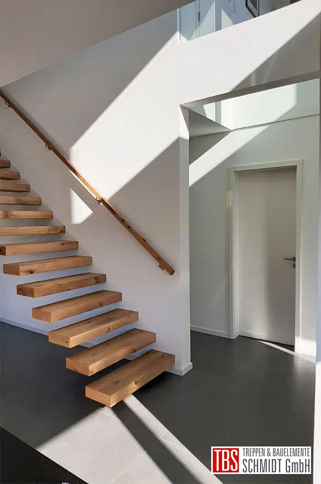 Die Kragarmtreppen verläuft über 17 Steigungen durch den offenen Wohnraum in das Obergeschoss des Wohnhauses und ist an eine Vollholzwand angebracht. Die Stufen sind in Eiche mit Rissen und Spachtelstellen geölt hergestellt. Passend dazu ist der eckige Wandhandlauf gefertigt, welcher zum sicheren Begehen der Treppe dient.