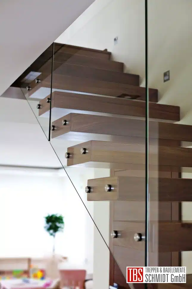 Die Kragarmtreppe aus Eiche geräuchert führt als gerader Verlauf über 16 Steigungen durch den offene Wohnbereich. Das Glasgeländer beginnt ab der ersten Stufe und ist mittels Punkthaltern an die Stufenköpfe befestigt. An der Oberkante ist ein eckiger Holzhandlauf, ebenfalls in Eiche geräuchert, montiert. In der Galerie führt dieses fließend als Brüstungsgeländer weiter. In der Wand sind sechs LED-Beleuchtungen angebracht.