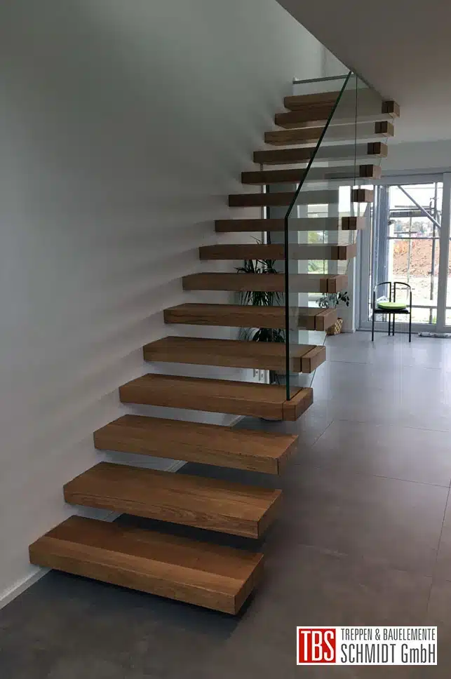 Ab der vierten Kragarmstufe ist das Glasgeländer mittels Verblendern an die Stufenköpfe montiert. Dadurch wird die Treppe optisch durch das Glas verlängert. Das Glas reicht bis zur Deckenkante.