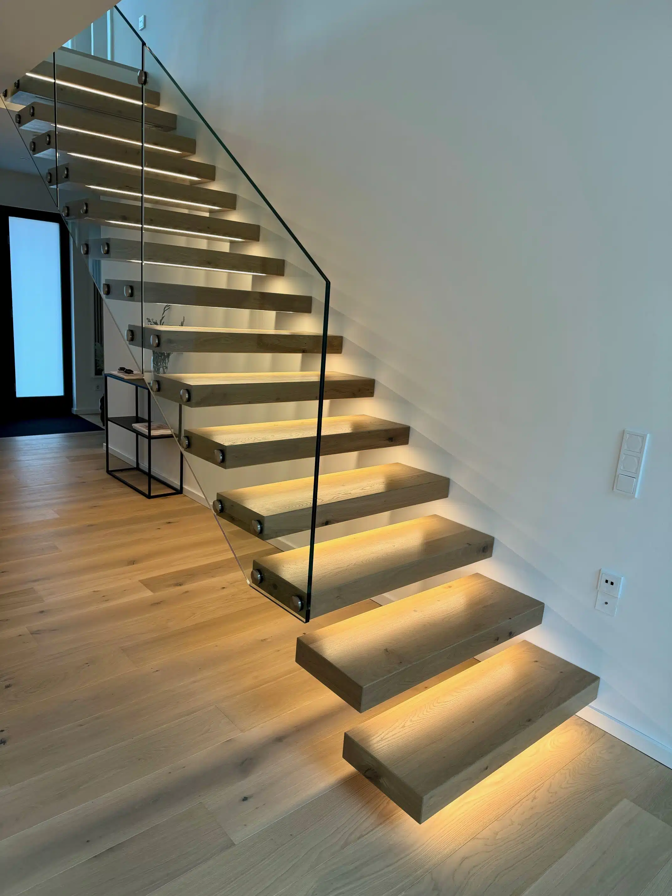 Die Kragarmtreppe verläuft über 16 Steigungen als gerade Treppenanlage ins Obergeschoss. Ab der dritten Stufe beginnt das dreiteilige Glasgeländer, welches in der Galerie fortgeführt wird. Die integrierte LED-Beleuchtung ist das Highlight der Treppe und kann als Lauflicht umgesetzt werden.