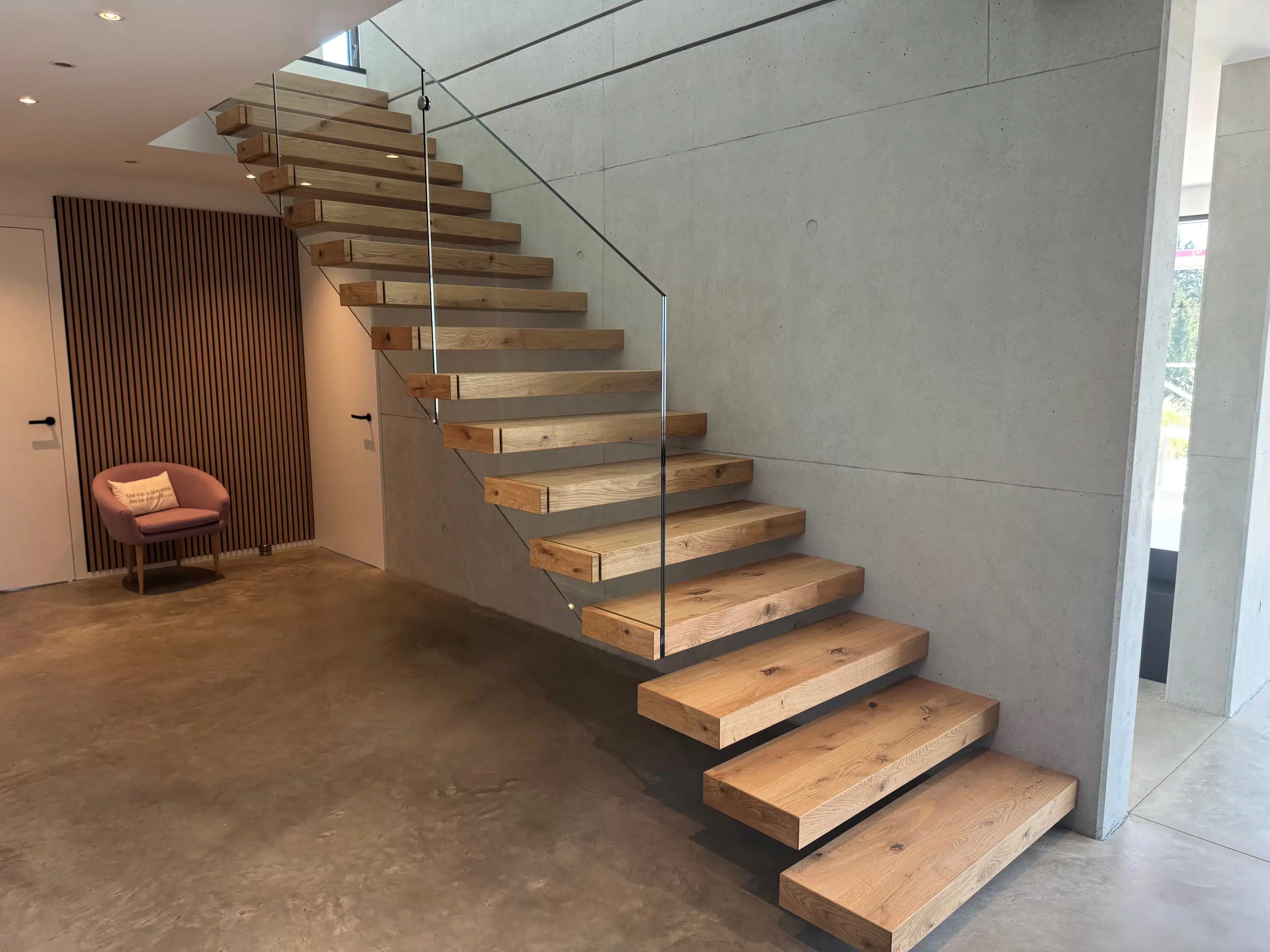 Über 18 Steigungen verläuft die gerade Kragarmtreppe aus Eiche mit Rissen und Spachtelstellen. Das Glasgeländer beginnt ab der vierten Stufe und besitzt zudem Stufenverblender.