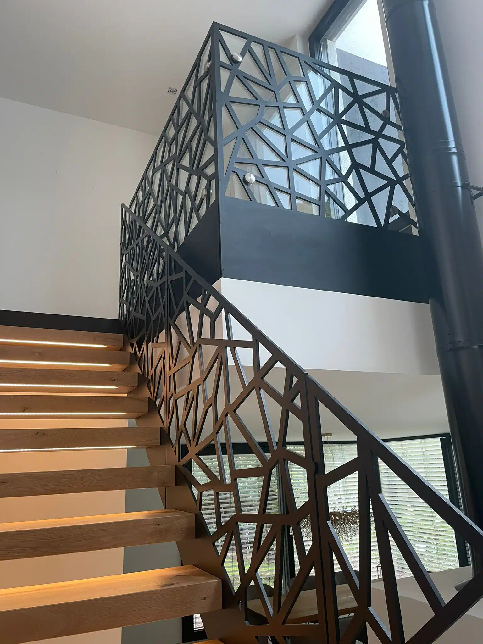 Das Designgeländer ist aus 10mm Stahlblech schwarz in RAL9011 Perlstruktur lackiert gefertigt und an den Stufenköpfen montiert. Die unregelmäßigen Vielecke sind gelasert. Das Geländer ist dreiteilig.