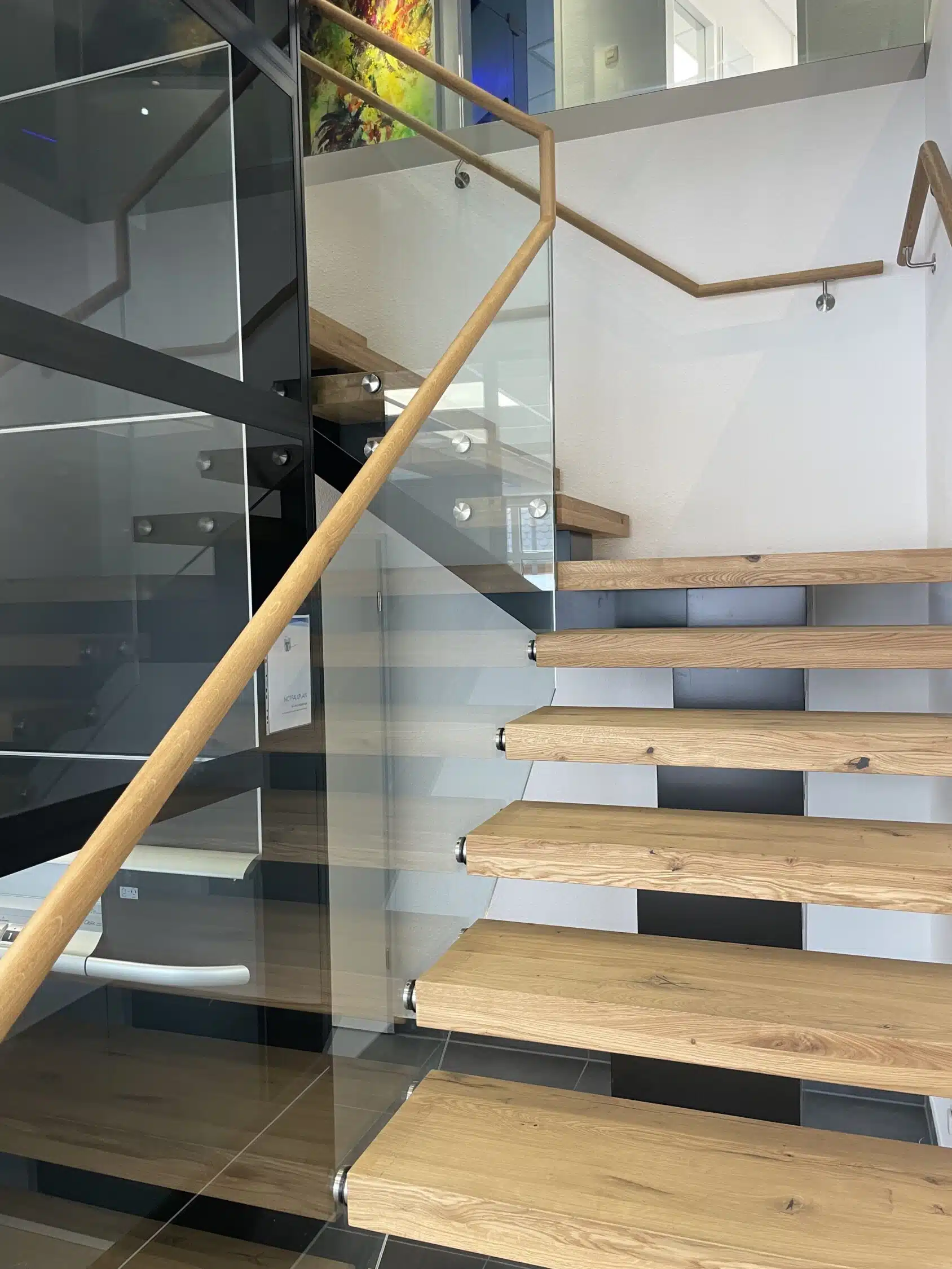 Das Glasgeländer beginnt ab der zweiten Stufe und verläuft im Obergeschoss fließend in die Galerie über. Der runde Kantenschutz wird passend an der Wand als mitlaufendes Geländer fortgeführt.