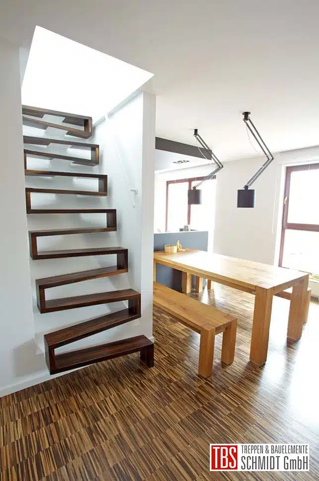 Die gerade Raumspartreppe überzeugt durch ihre Eleganz und Ästhetik und wird durch den skulpturalen Charakter zum Blickfang. Die Treppe dient dem Zugang zum Dachgeschoss und ist aus Eiche geräuchert gefertigt. Der weiße Wandhandlauf dient dem Sicherheitsaspekt.