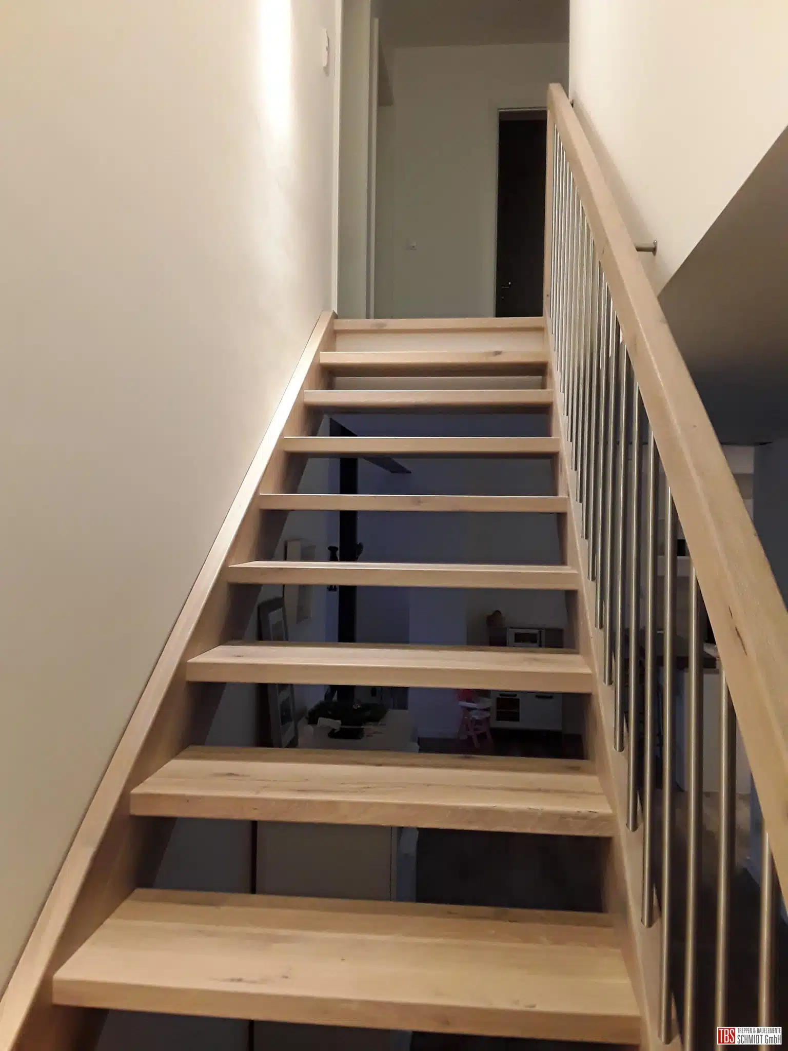 Das Treppengeländer besteht aus einem Holzhandlauf, ebenfalls aus Eiche gekält geölt und senkrechten Edelstahlstäben.
