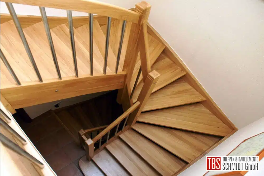 Die Wangentreppe führt halbgewendelt durch zwei Etagen des Wohnhauses und ist aus Eiche gefertigt. Das Treppengeländer besteht aus einer Kombination aus Holz und Edelstahl. Die Treppenpfosten sind im oberen Bereich gedrechselt, der Handlauf ist abgerundet und dazwischen sind senkrechte Edelstahlstäbe eingesetzt.