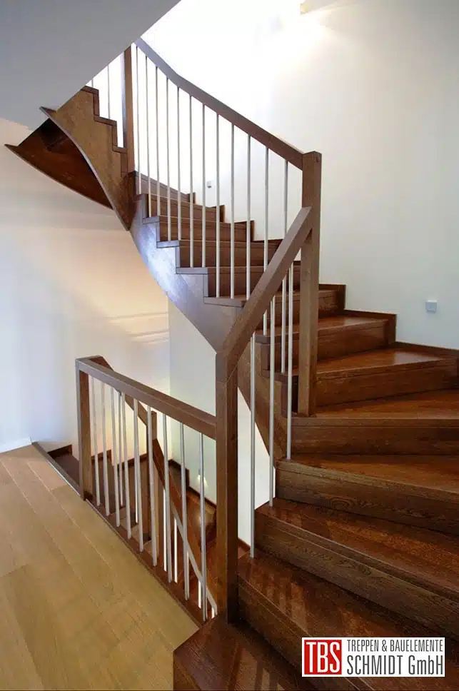 Die halbgewendelte Wangen-Faltwerktreppe aus Eiche geräuchert verläuft über zwei Stockwerke. Das Treppengeländer besteht aus senkrechten Edelstahlstäben, welches an der Oberkante einen eckigen Holzhandlauf besitzt. Dieses wird auch als Brüstungsgeländer fortgeführt. Zusätzlich ist eine integrierte LED-Beleuchtung in der Wand angebracht.
