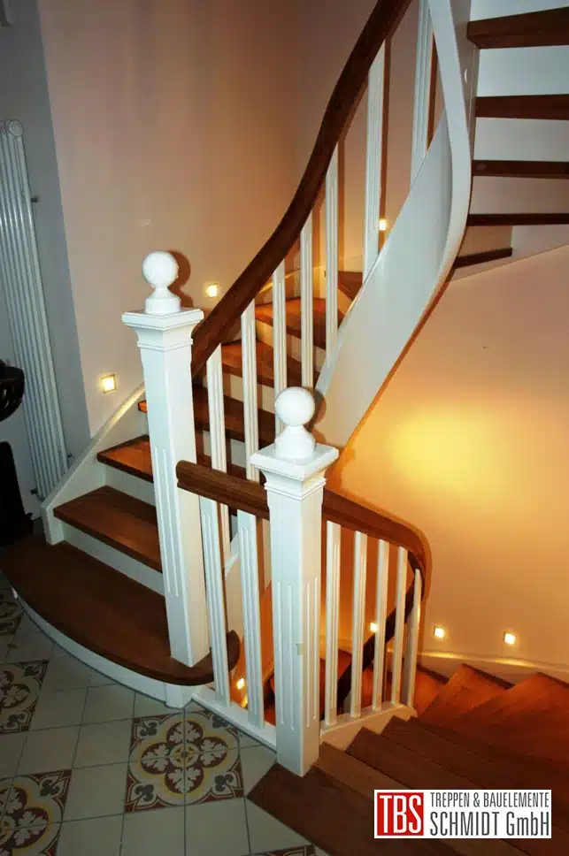 Die Treppenstufen, sowie der gedrechselte Holzhandlauf bestehen aus Eiche.