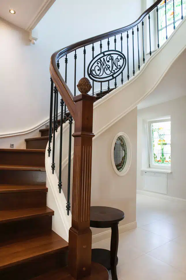 Die geschlossene Color-Wangentreppe führt halbgewendelt durch das offene Treppenhaus. Die Treppe besteht aus weißen Wangen, Stufen aus Eiche geräuchert und einem klassischen, rustikalen Geländer. Gedrechselte Pfosten und der geschwunge Handlauf bilden das Gerüst für die senkrechten Stahlstäbe. In der Galerie wird das Geländer fließend fortgeführt.