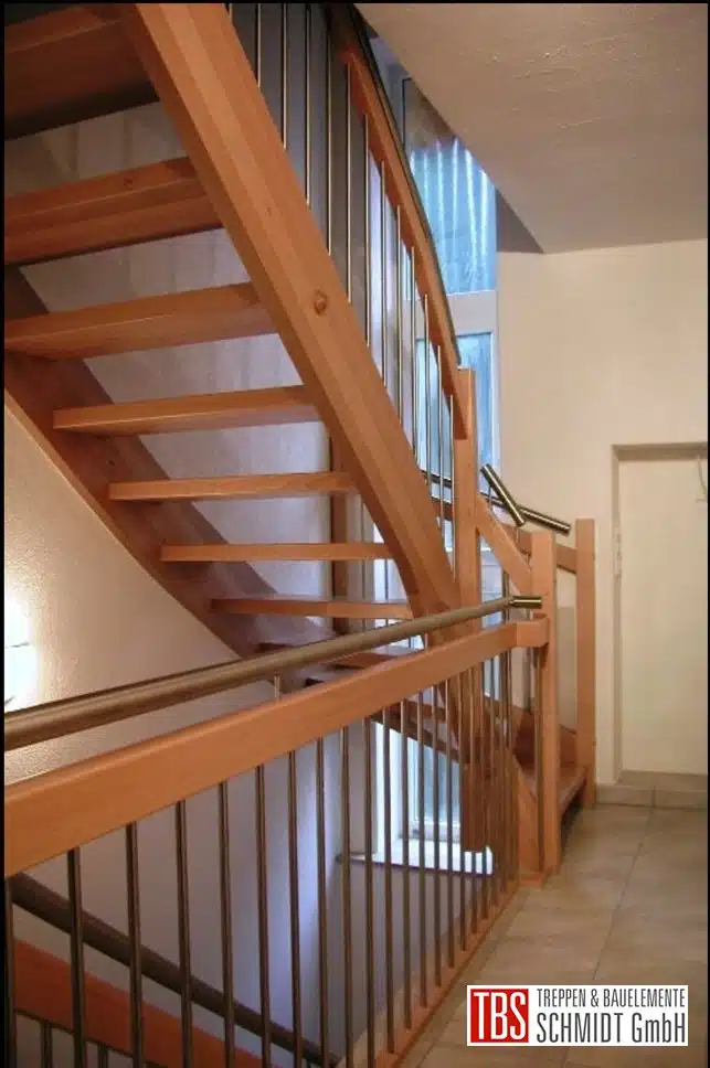 Das Grundgerüst ist aus Holz gefertigt, dazwischen sind die senkrechten Edelstahlstäbe angebracht und der runde Holzhandlauf sorgt für das sichere Begehen der Treppe.